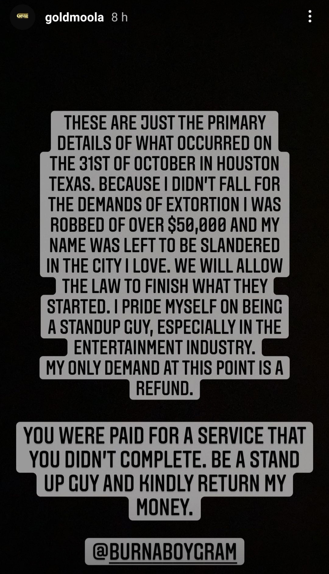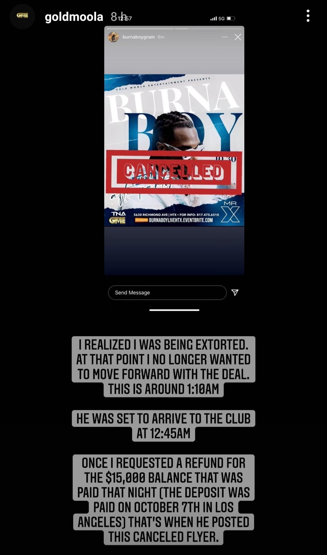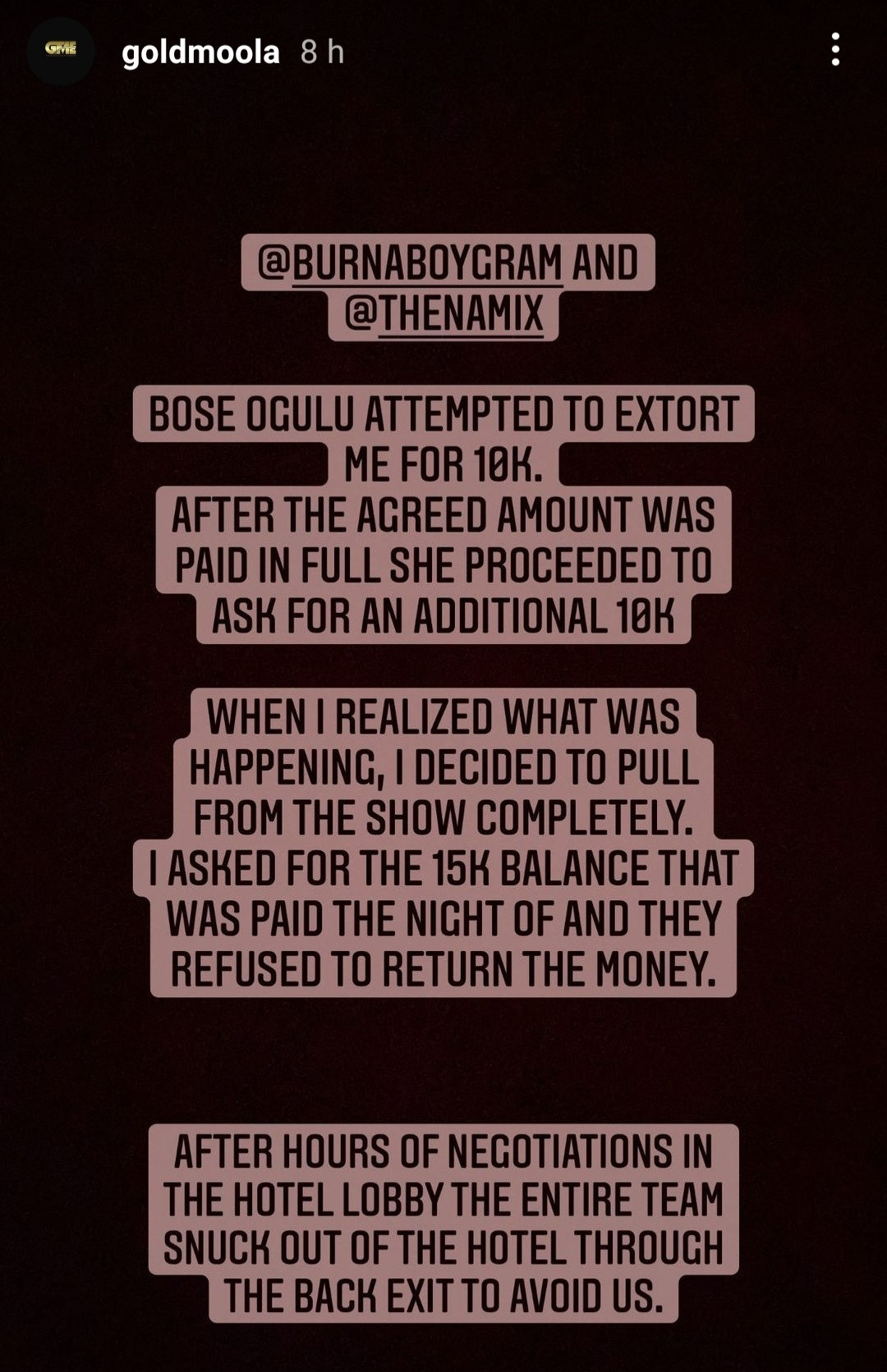 He said he realized then that he was being extorted so he refused and Burna immediately went on social media to post that the show has been cancelled and then he and his team snuck out of the hotel through the back.