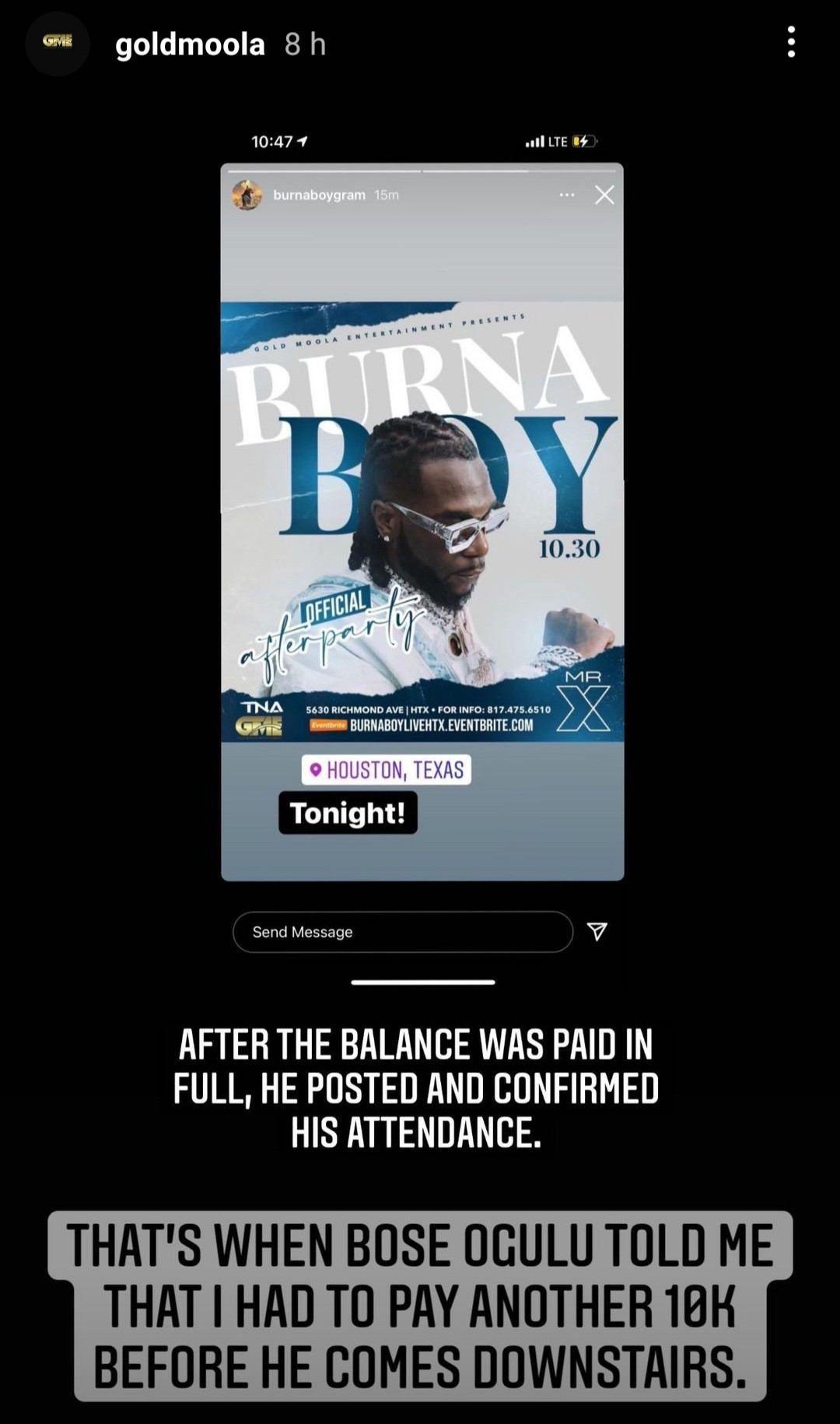 He then goes on to claim that Burna's mum, who doubles as his manager, asked him to pay an additional $10,000 before Burna would come down from his hotel room to perform.
