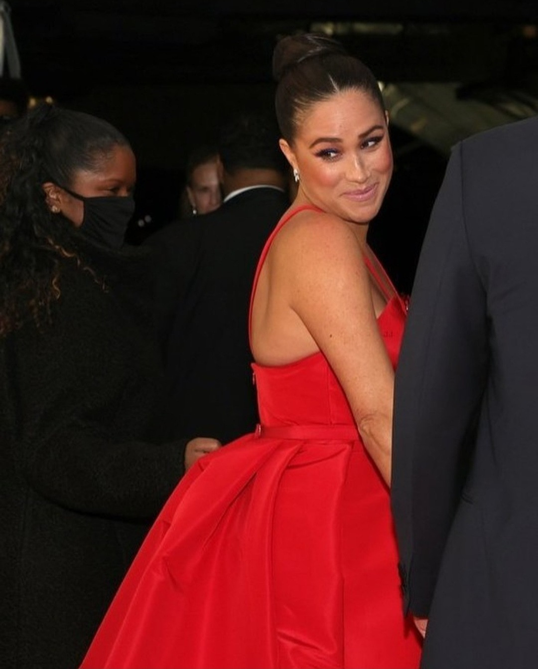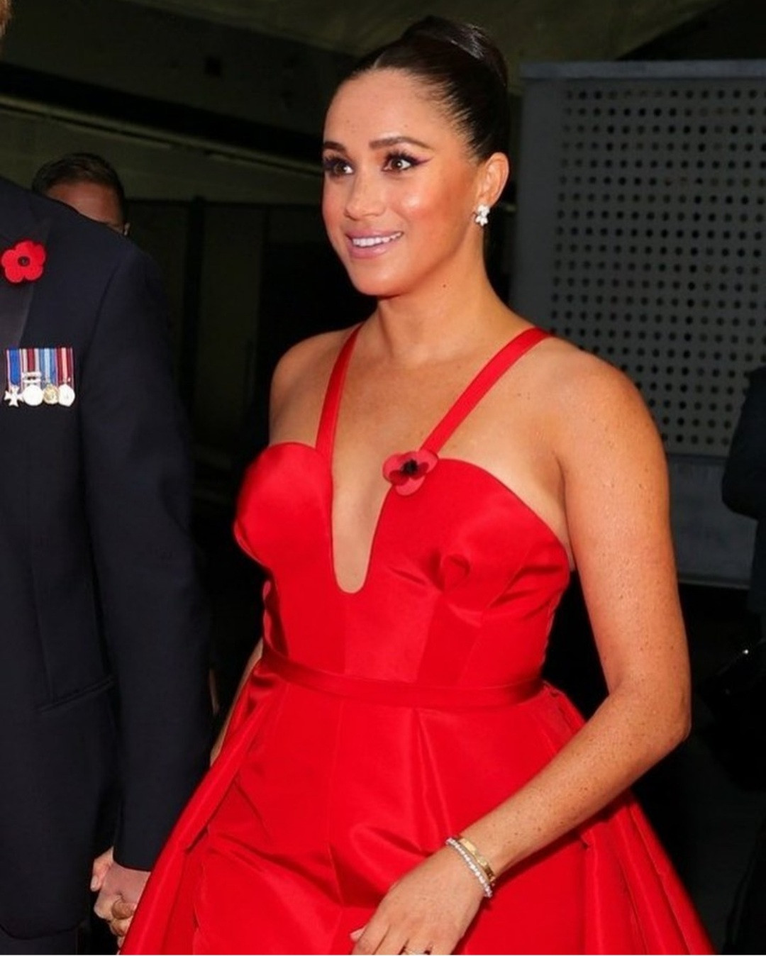 Meghan looked regal in a red gown with a plunging neckline and an A-line style train. She added a poppy to her dress, a symbol Brits have worn since 1921 to honor Remembrance Day.