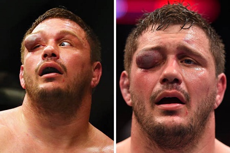 An UFC fighter's eye was grossly disfigured during a wrestling bout. Matt Mitrione was seen nursing a grossly disfigured eye after a fight with Ronda Rousey's boyfriend, Travis Browne. Still, the heavyweight brawler seems to have sustained most damage from a blow during the third round after alleging that his opponent poked his eyes trying to gouge it out.