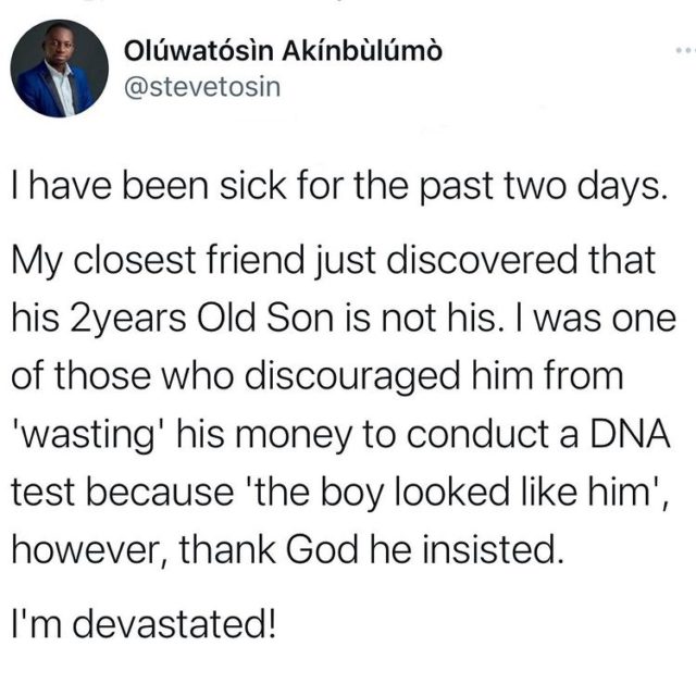 “I have been sick for the past two days. My closest friend just discovered that his 2years Old Son is not his. I was one of those who discouraged him from ‘wasting’ his money to conduct a DNA test because ‘the boy looked like him’, however, thank God he insisted.