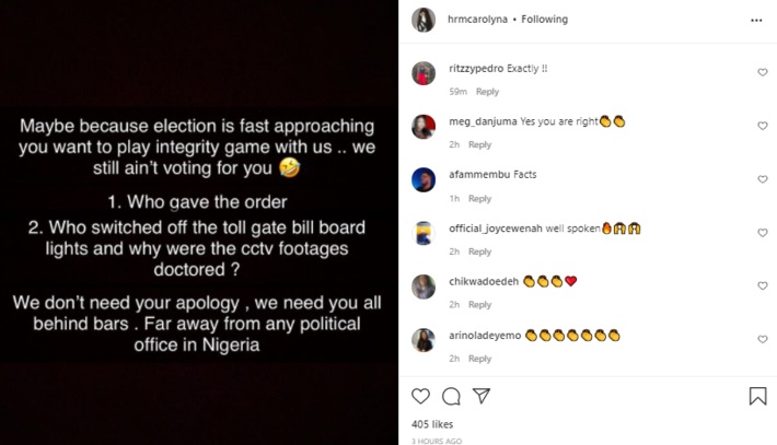 She said, “Who gave the order? Who switched off the toll gate billboard lights and why was the CCTV footage doctored? We don’t need your apology, we need you all behind bars. Far away from any political office in Nigeria.”