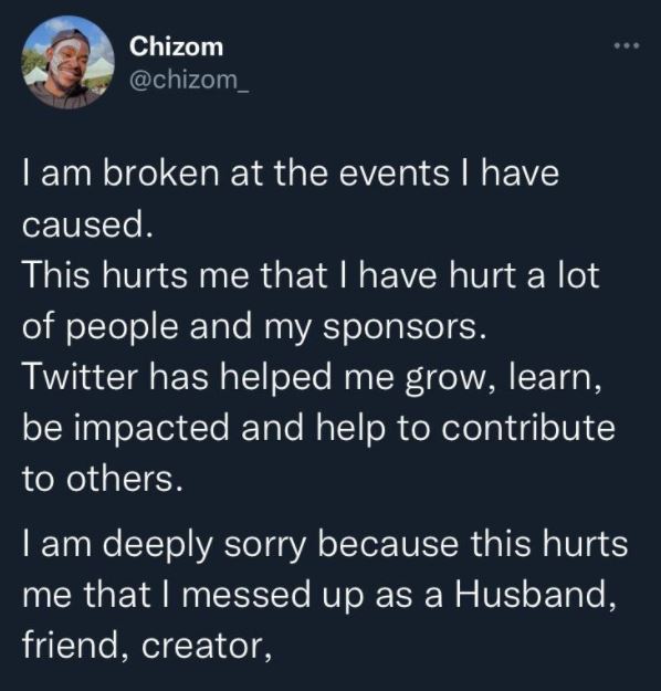 Well, Chizom has now reacted to the claim. Reacting via his Twitter handle, Chizom apologised for his behaviour but denied asking the ladies for s3x.