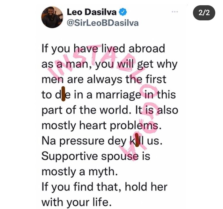 Nigerian reality star, Leo DaSilva has revealed why most men die first before their wives in marriage especially in Africa.