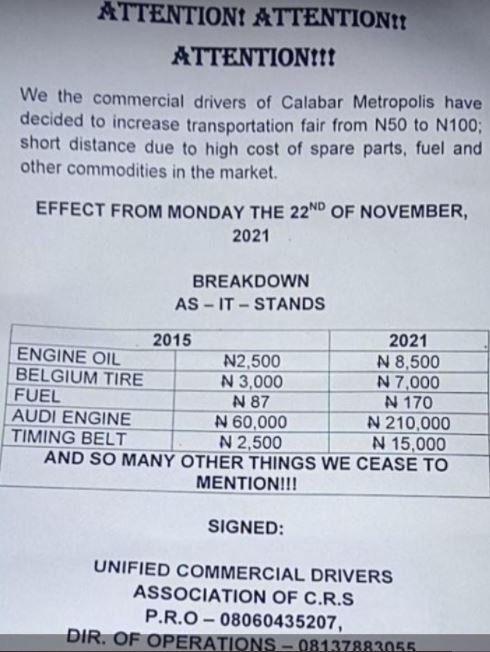 Commercial drivers in Calabar, the Cross-rivers capital have released a memo to inform residents of the hike in the prices of car spare parts and maintenance.