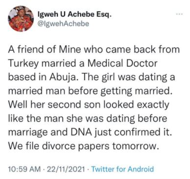 ''A friend of Mine who came back from Turkey married a Medical Doctor based in Abuja. The girl was dating a married man before getting married. Well her second son looked exactly like the man she was dating before marriage and DNA just confirmed it. We file divorce papers tomorrow.