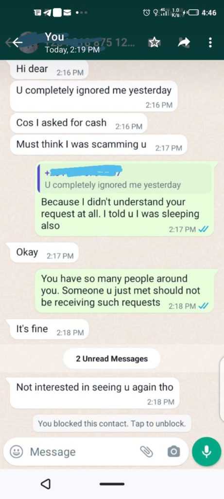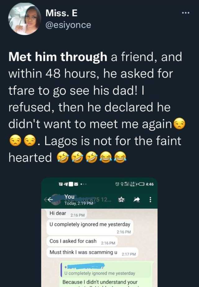 “Met him through a friend, and within 48 hours, he asked for tfare to go see his dad! I refused, then he declared he didn’t want to meet me again😒😒😒. Lagos is not for the faint hearted 🤣🤣🤣😂😂,” she wrote while sharing a snapshot of their conversation right after blocking him off her contact list.