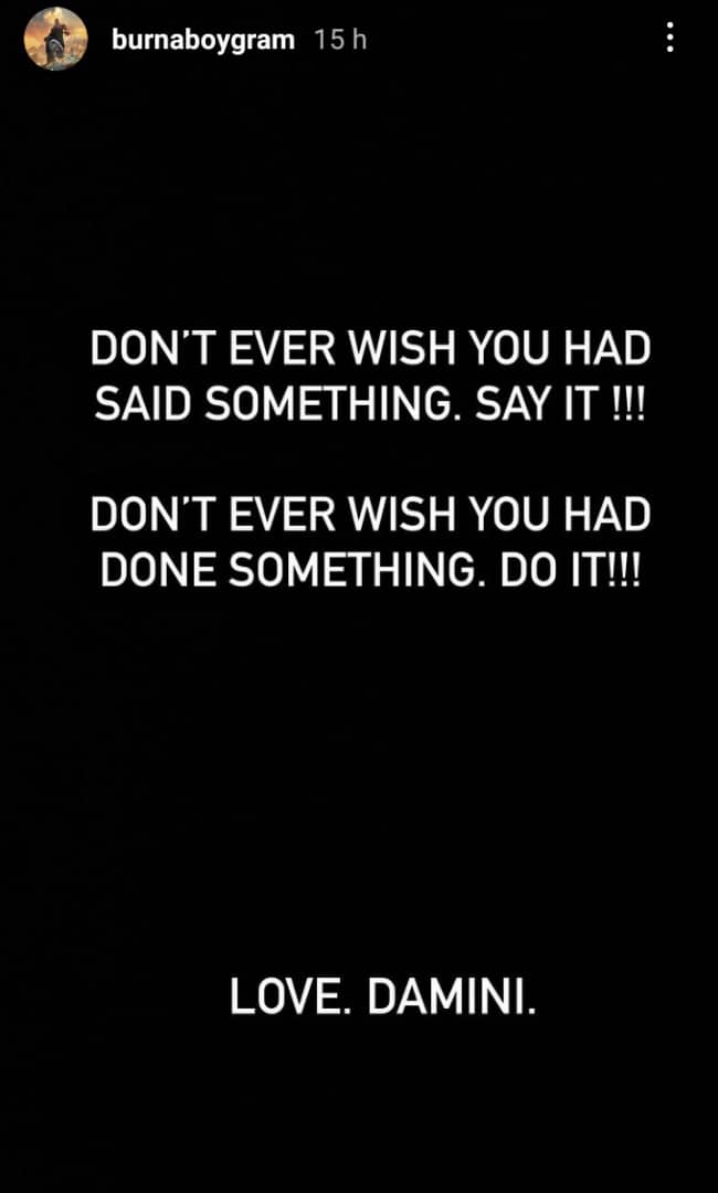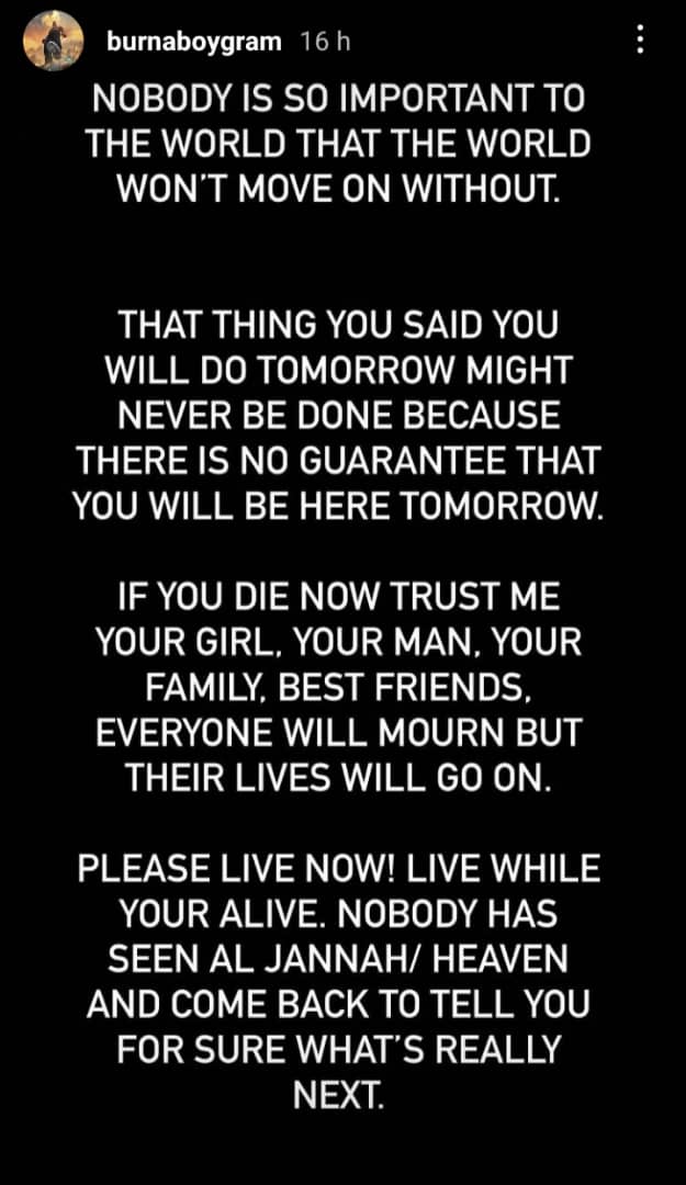 Burna Boy wrote, “Nobody is so important to the world that the world won’t move on without. That thing you said you will do tomorrow might never be done because there is no guarantee that you will be here tomorrow.