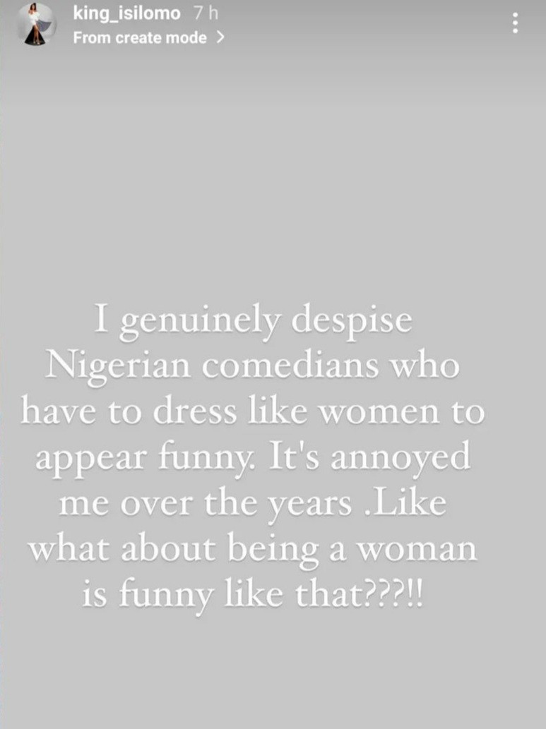 The Big Brother Naija star had said she "genuinely despises" Nigerian comedians who dress like women to appear funny.