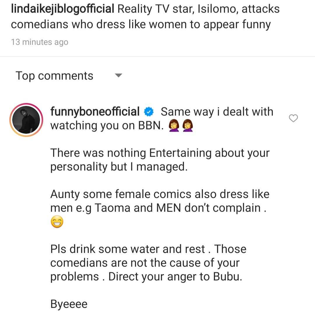 Funnybone has lashed out at reality star, Isilomo over her comment on male comedians who dress as women to entertain.