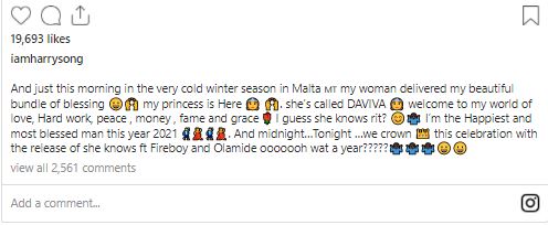 And just this morning in the very cold winter season in Malta 🇲🇹 my woman delivered my beautiful bundle of blessing 😀🙌 my princess is Here 👸 🙌. she’s called DAVIVA 👸 welcome to my world of love, Hard work, peace , money , fame and grace 🌹 I guess she knows rit? 😊🤷🏿♂️ I’m the Happiest and most blessed man this year 2021 🕺💃🕺💃. And midnight…Tonight …we crown 👑 this celebration with the release of she knows ft Fireboy and Olamide ooooooh wat a year?????🤷🏿♂️🤷🏿♂️🤷🏿♂️😀😀