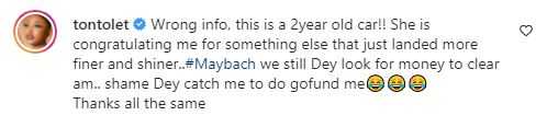Doris Ogala hailed Tonto Dikeh over the new car and expressed love for her, adding that the new ride is loud.