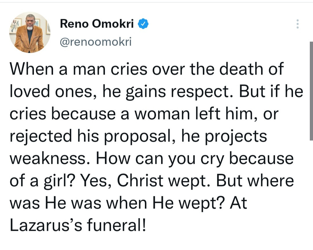 In a tweet shared on his handle, Reno wrote; ''When a man cries over the death of loved ones, he gains respect. But if he cries because a woman left him, or rejected his proposal, he projects weakness.