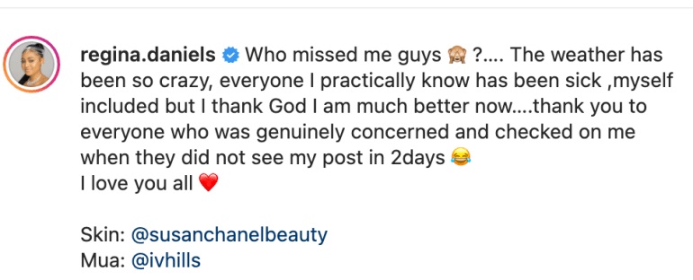 “Who missed me guys 🙈 ?…. The weather has been so crazy, everyone I practically know has been sick ,myself included but I thank God I am much better now….thank you to everyone who was genuinely concerned and checked on me when they did not see my post in 2days 😂