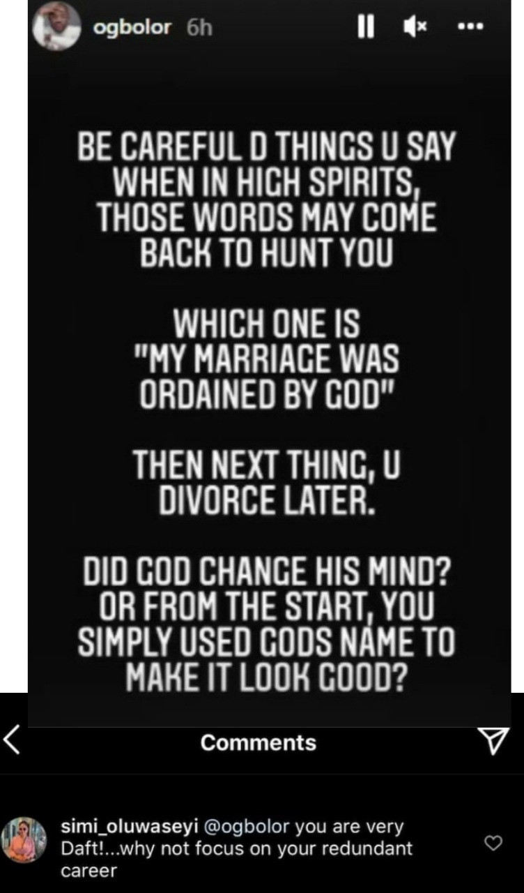 He wrote: "Be careful the things u say when in high spirit, those words may come back to hunt you. Which one is my marriage was ordained by God. Then next thing, you divorce later. Did God change his mind? Or from the start, you simply used God’s name to make it look Good?"