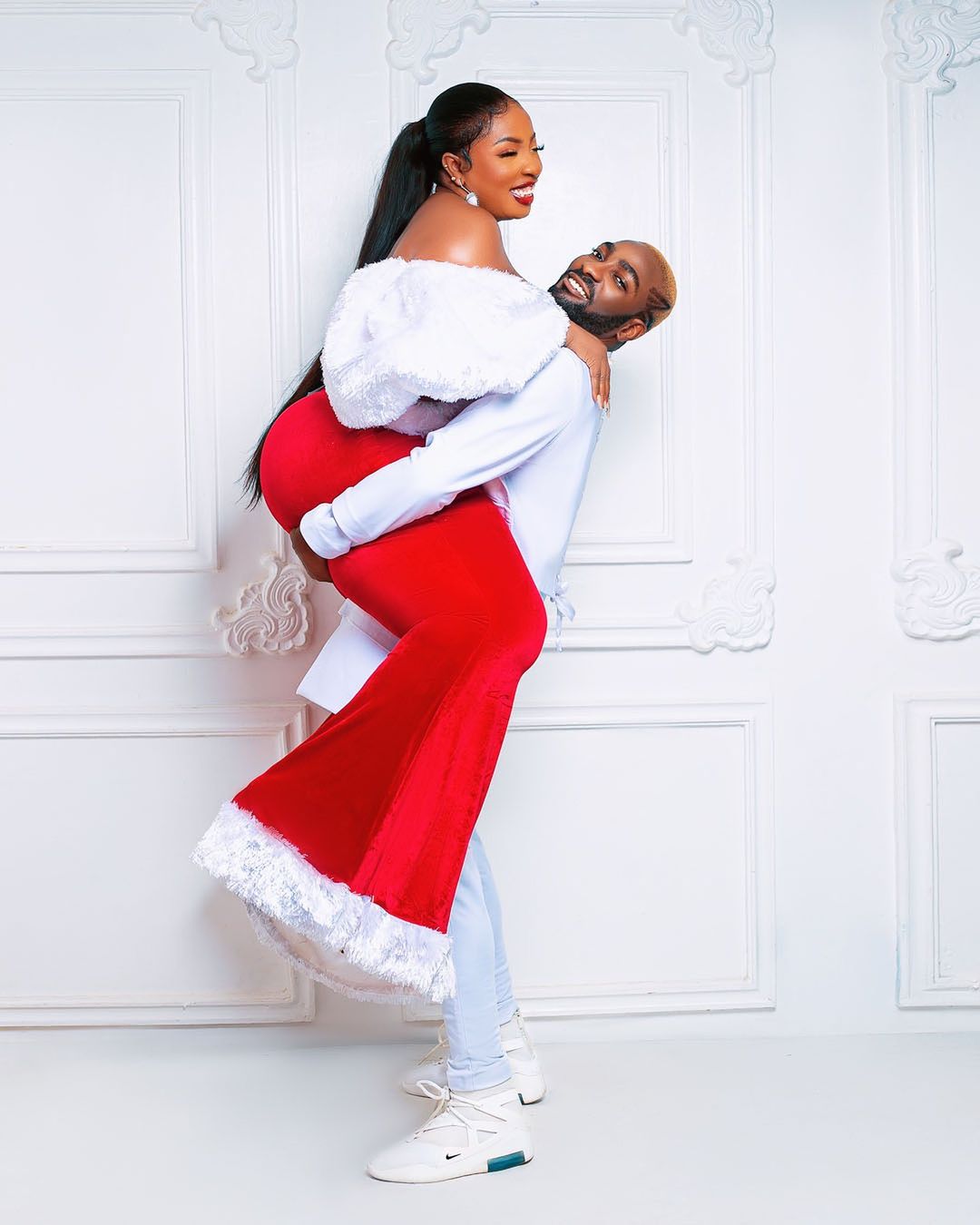 In one of the photos, the actress' husband, MC Fish carried his wife who donned a gorgeous red dress that has figure hugging shape on her.