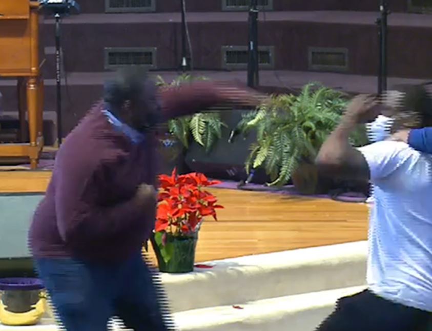 The preacher, Bishop Kevin Adams tried in vain to stop the fight, saying, "Stop it, Marcus. Marcus, come on."