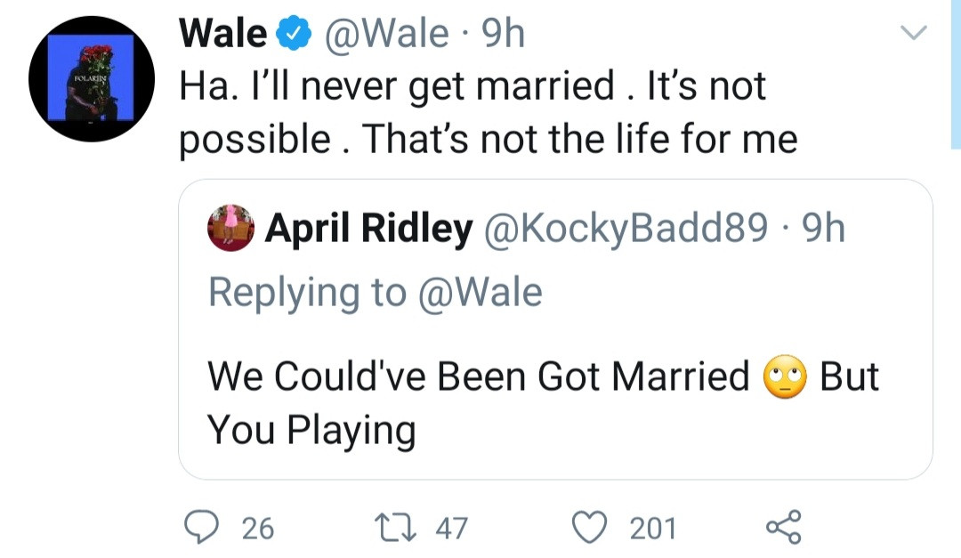 Wale responded: "I'll never get married. It's not possible. That's not the life for me."