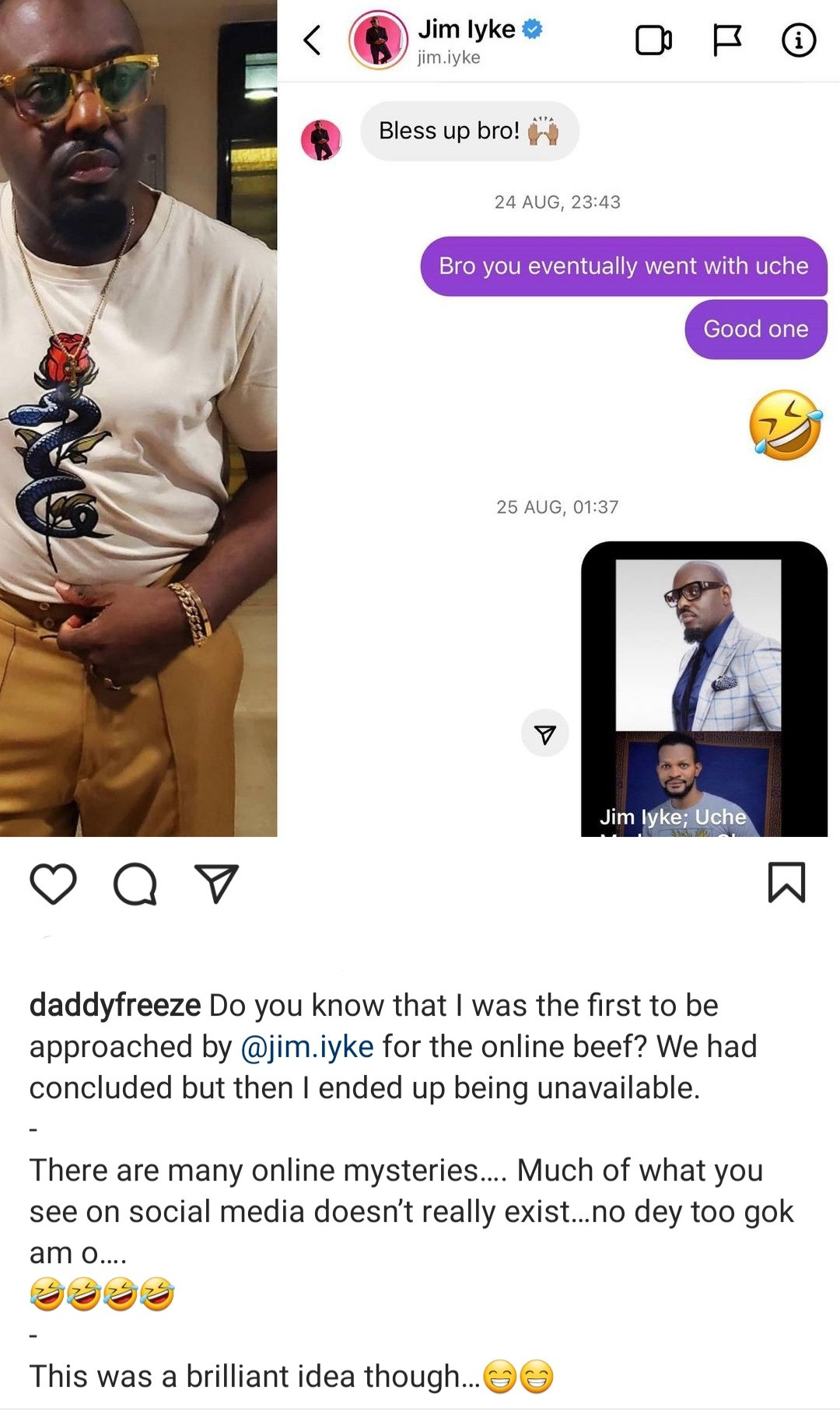 Freeze added that Jim Iyke's idea was brilliant then warned people that most of what they see on social media aren't real.