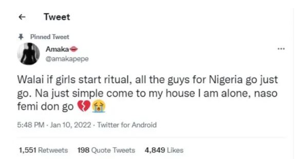 “Walai if girls start ritual, all the guys for Nigeria go just go. Na just simple come to my house I am alone, naso femi don go”