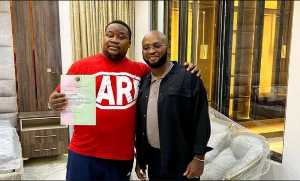 Cubana Chief Priest showcases appointment letter as he poses with Imo Assembly Deputy Speaker, Amarachi Iwuanyanwu on Friday. Credit: Cubana Chief Priest