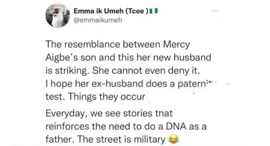 According to him, the resemblance of Mercy Aigbe’s son and her new husband is striking.