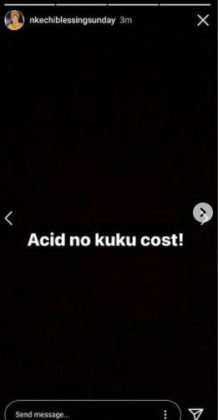 In reaction to the subtle threats, Nkechi Blessing took to her Instastory to counter the threats with a note that reads, “acid no kuku cost.”