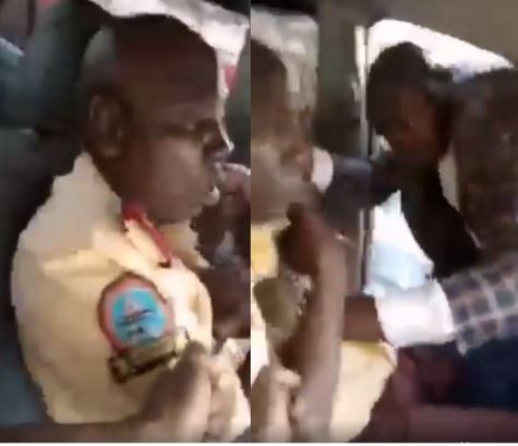 In a video shared online, the security operative, said to be a police officer, is seen assaulting the LASTMA official and trying to put handcuffs on him.