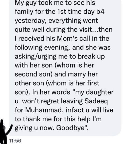 She wrote: “My guy took me to see his family for the 1st time day b4 yesterday, everything went quite well during the visit…then I received his Mom’s call in the following evening, and she was asking/urging me to break up with her son (whom is her second son) and marry her other son (whom is her first son).