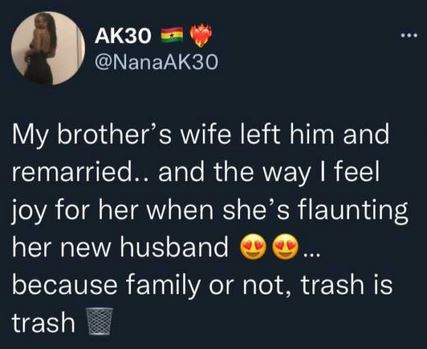 “My brother’s wife left him and remarried.. and the way I feel joy for her when she’s flaunting her new husband 😍😍… because family or not, trash is trash 🗑,” she wrote.