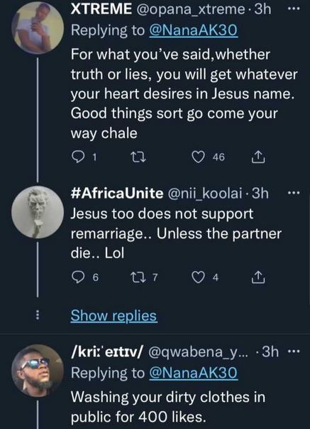 A lady identified as @NanaAK30 on Twitter has expressed excitement after her brother's wife dumped him for another man.