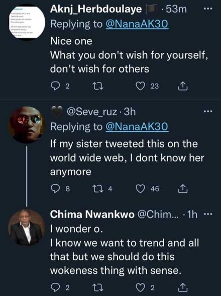 According to Nana, the joy that fills her heart to see the woman glowing with her new husband is unquantifiable while tagging her brother as ‘trash.’