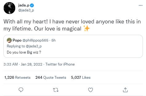 Wizkid's babymama, Jada Pollock has confessed total love for the musician on Twitter.