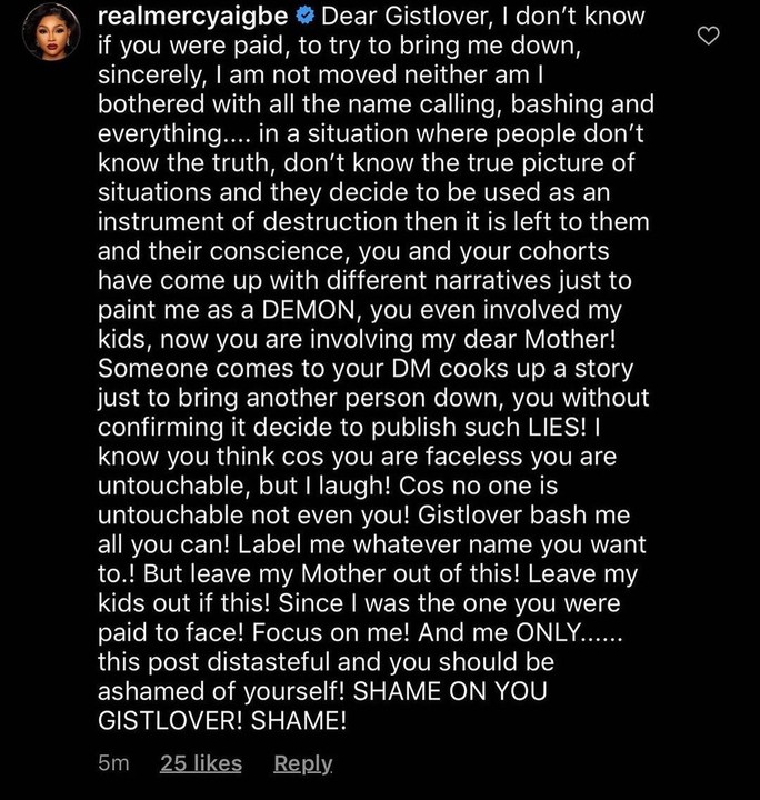 Speaking further, she warned: ” Cos no one is untouchable not even you! Gistlover bash me all you can! Label me whatever name you want to.! But leave my Mother out of this! Leave my kids out if this! Since I was the one you were paid to face! Focus on me! And me ONLY…… this post distasteful and you should be ashamed of yourself! SHAME ON YOU GISTLOVER! SHAME.”