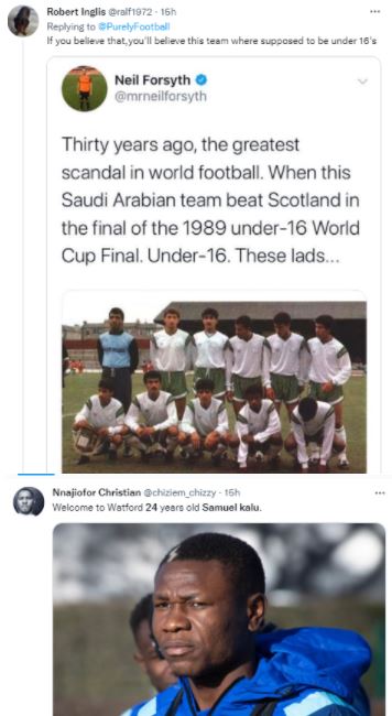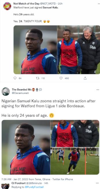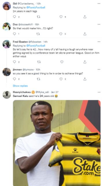 Some Nigerians have stormed the Twitter page of Watford football club to question the age of Super Eagles footballer, Samuel Kalu.