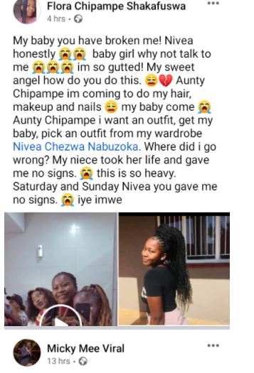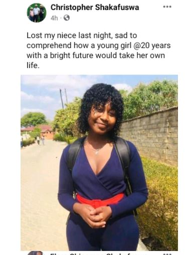 Christopher Shakafuswa, a member of Parliament for Mandevu constituency in Zambia, is mourning the painful loss of his 20-year-old niece, Nivea Chezwa Nabuzoka, who took her own life on Thursday night, January 27.