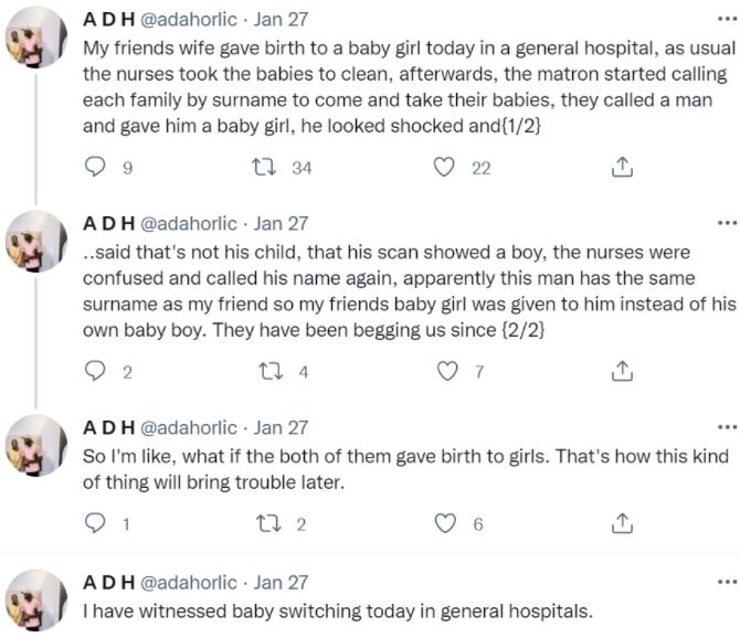 In what will come across as a really startling development, a Nigerian Twitter user has narrated how her friend's baby was switched with another at a general hospital.