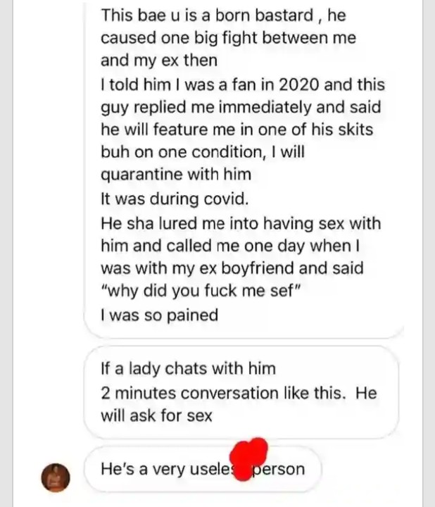 Nigerian Instagram content creator, Adebayo Ridwan Abidemi aka 'IsBae U’ has been accused of breaking a lady's relationship after sleeping with her.