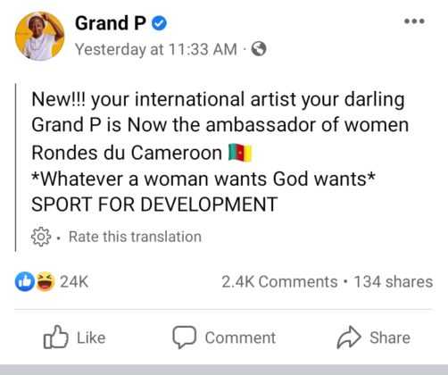 “New!!! your international artist your darling Grand P is Now the ambassador of women Rondes du Cameroon Whatever a woman wants God wants.