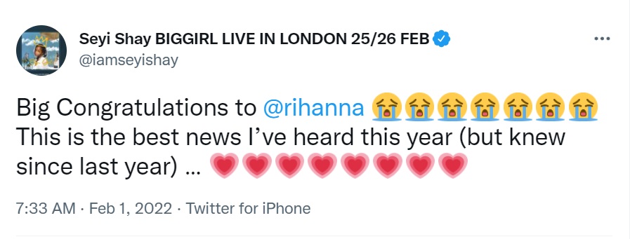Nigerian singer, Seyi Shay has taken to her Twitter page to claim that she had prior knowledge of international musician, Rihanna's pregnancy.
