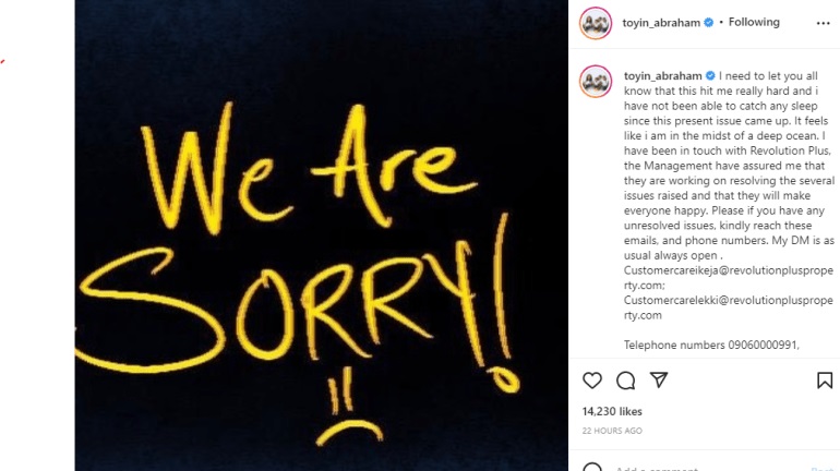 Nollywood actress and filmmaker, Toyin Abraham has said she's sorry after being dragged online over an alleged property scam.