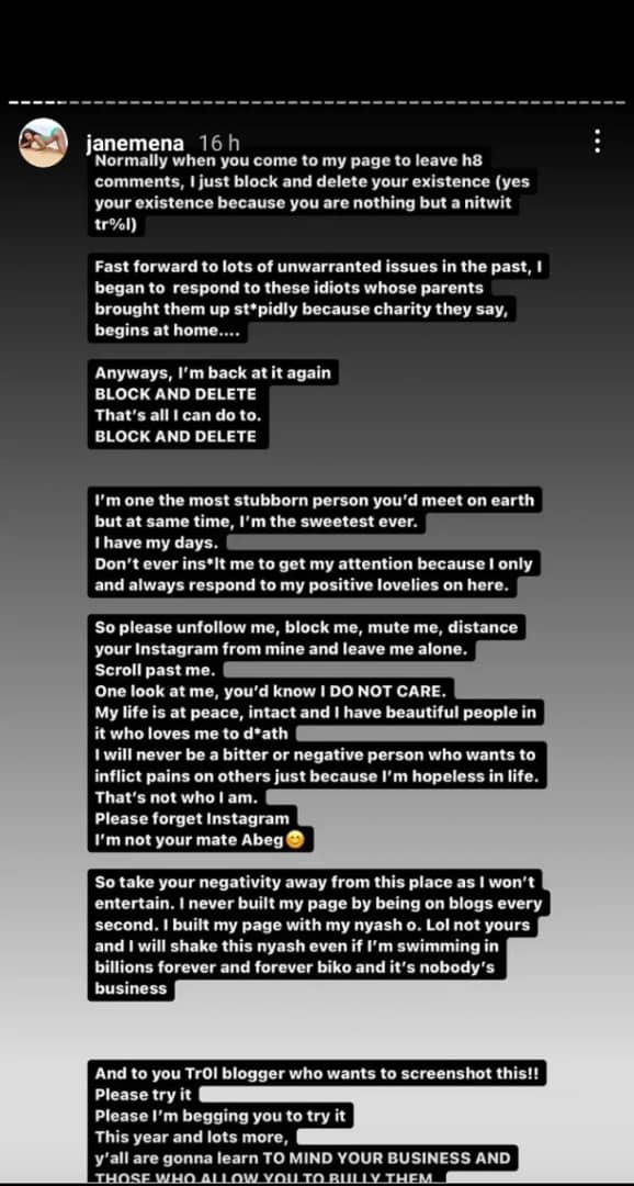 In a post sighted on her Instagram story, Janemena disclosed that she built her page and brand with her backside and twerking videos and not because blogs have been posting her over one scandal or another.