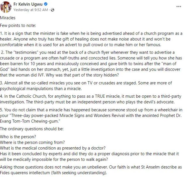 A popular clergyman, Catholic priest, Fr. Kelvin Ugwu has warned Nigerians that most of the miracles advertised on television and crusades are fake/staged.