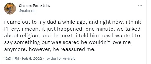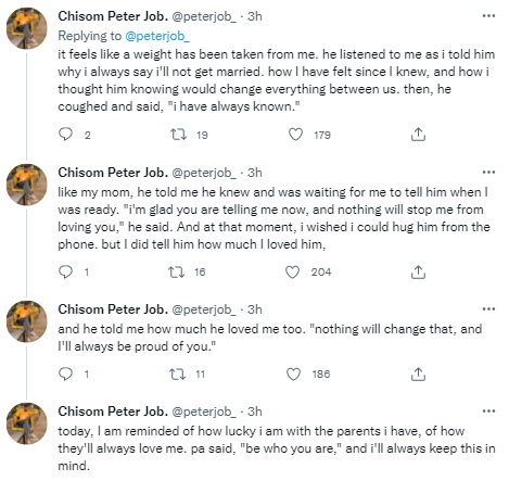 Chisom in a thread shared on his handle this afternoon said he was scared to open up to his father but that when he did, his father responded that he had always known and was waiting for him to tell him.