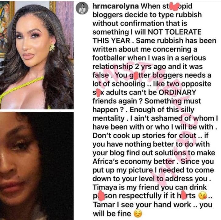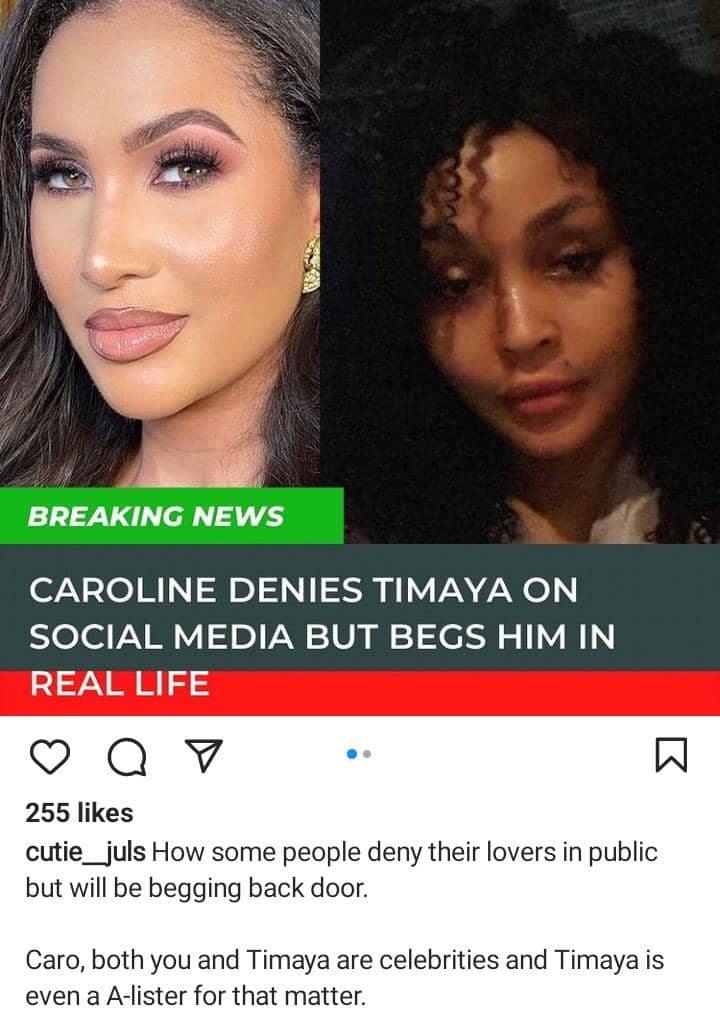 Caroline Hutchings has finally addressed allegations that she's secretly dating musician, Timaya.