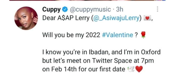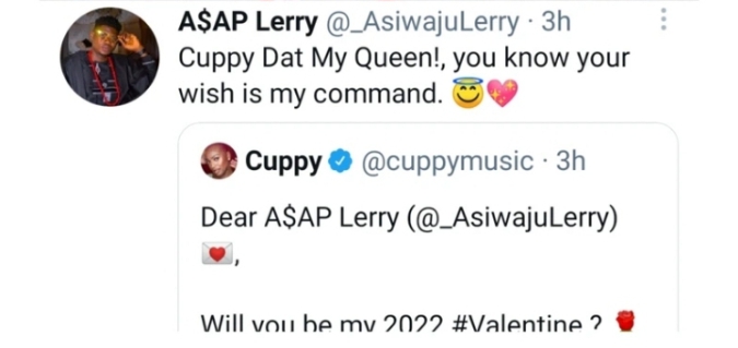 DJ Cuppy contacted the young man over Twitter, noting his name and Twitter handle, and asking if he would accept to be her Valentine.