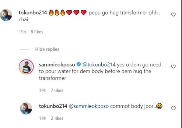 Showing that he’s in support of the followers’ comment, Sammie Okposo added, “Yes, dem go need to pour water on dem bodies before dem hug the transformer.”