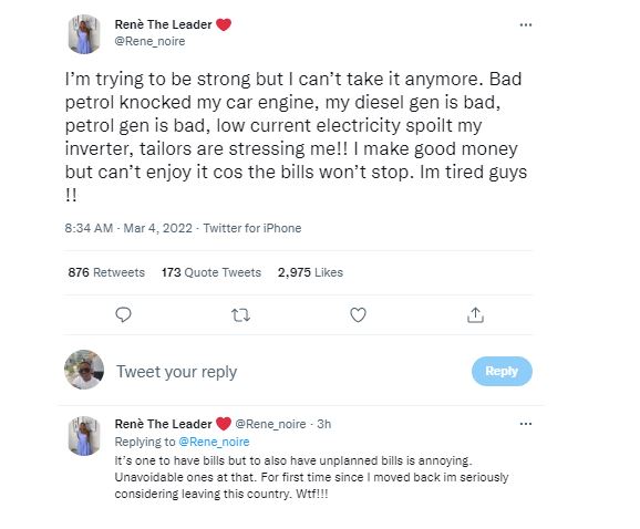 ''I’m trying to be strong but I can’t take it anymore. Bad petrol knocked my car engine, my diesel gen is bad, petrol gen is bad, low current electricity spoilt my inverter, tailors are stressing me!! I make good money but can’t enjoy it cos the bills won’t stop. Im tired guys !!