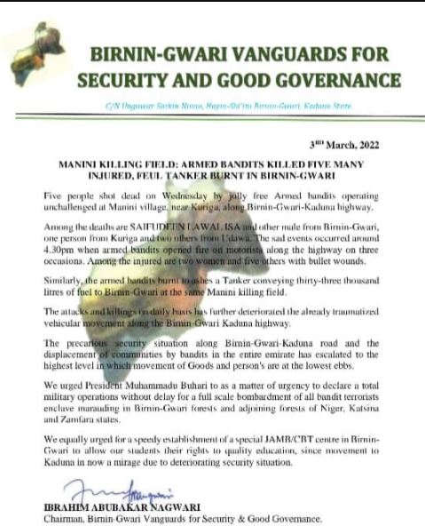 "The precarious security situation along Birnin-Gwari-Kaduna road and the displacement of communities by the terrorists in the entire Emirate has escalated to the highest level in which movement of goods and persons are at the lowest ebb,"