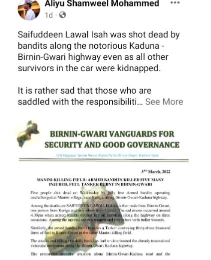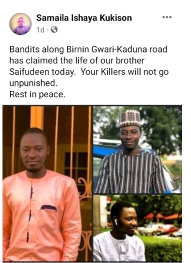 "The attacks and killings in the area are on daily basis. It has further deteriorated the already traumatised vehicular movement along the Brinin-Gwari-Kaduna highway,"